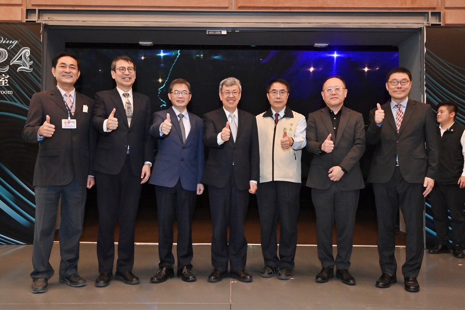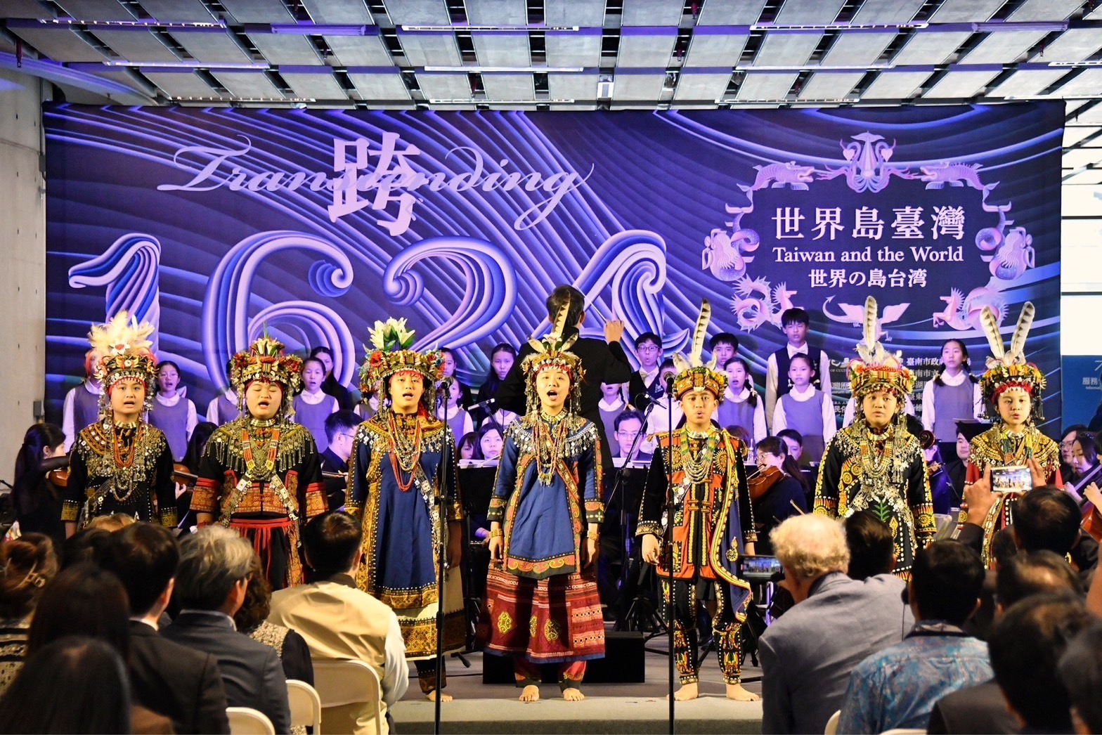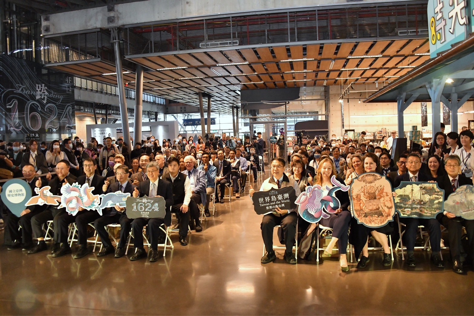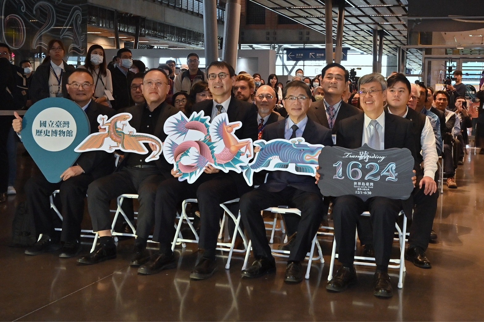 行政院陳建仁院長於2日在行政院李孟諺秘書長、林子倫發言人、文化部史哲部長、國立故宮博物院蕭宗煌院長、國立臺灣歷史博物館張隆志館長、臺南市黃偉哲市長、賴惠員立法委員、行政院雲嘉南區聯合服務中心劉米山副執行長等人的陪同下,前往國立臺灣歷史博物館出席「跨‧1624:世界島臺灣」特展開幕式,首先和與會貴賓一同欣賞TASO台灣藝術家交響樂團、排灣族原住民青年及右武衛兒童合唱團開場表演,並與日本國立歷史民俗博物館西谷大館長、神戶市立博物館油井洋明館長、荷蘭在臺辦事處經濟韌性政策資深統籌官馮奕琦(Jikkie Verlare)及荷蘭國家博物館Eveline Sint Nicolaas資深研究員及其他貴賓於座位區手持「跨‧1624:世界島臺灣」標語與大家合影留念。