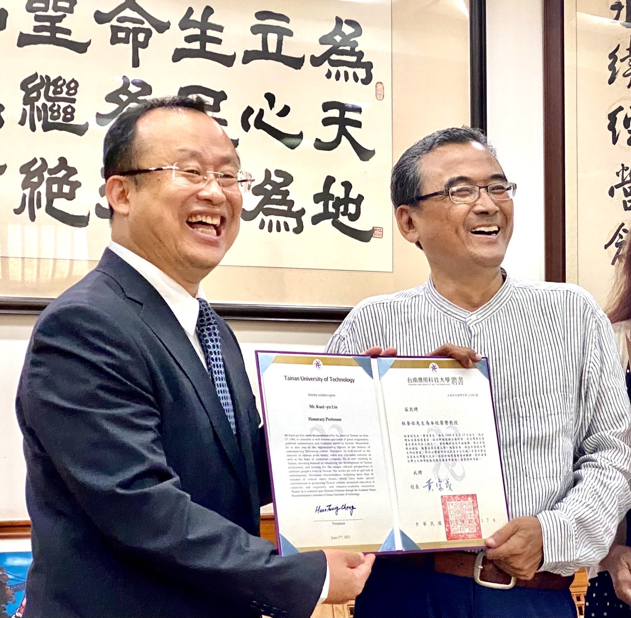 台南應用科技大學於今(4)日頒發榮譽教授證書予林奎佑教授。儀式場面簡單隆重,林奎佑教授並贈與其著作給黃宗成校長與8月即將就任的新校長楊正宏博士。與會嘉賓包括臺南市副市長趙卿惠、行政院雲嘉南區聯合服務中心副執行長王開玹、國立臺灣歷史博物館館長張隆志博士與國立成功大學工程科學系名譽教授莊哲男博士。