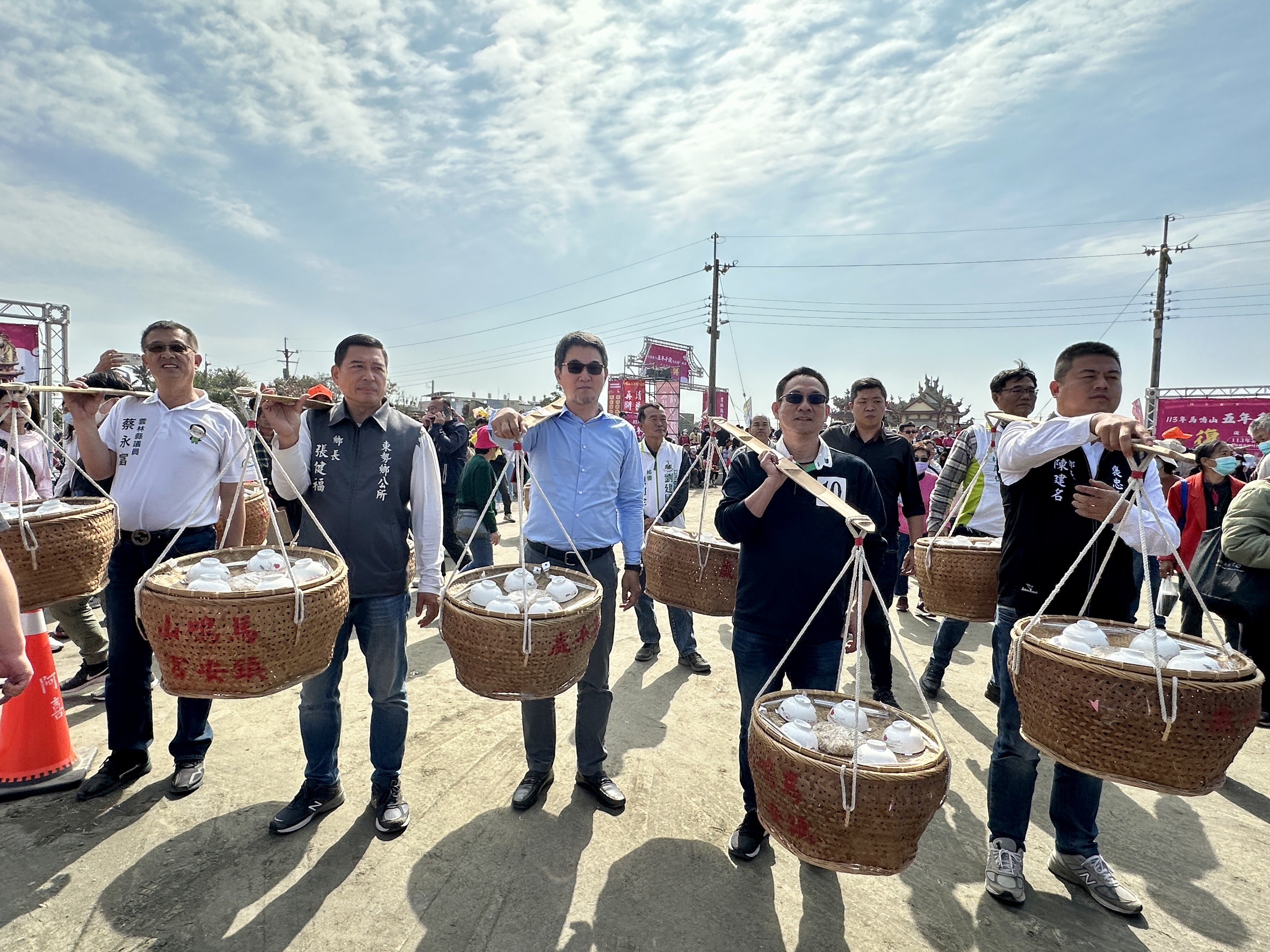 「113年馬鳴山五年千歲吃飯擔文化節」於今(24)日在在東勢鄉復興村三安宮盛大登場,立法委員劉建國、行政院雲嘉南區聯合服務中心執行長許根尉、東勢鄉長張健福、褒忠鄉長陳建名、議員蔡永富、議員顏嘉葦服務處助理林漢宗、東勢鄉復興村村長張文發、馬鳴山鎮安宮主任委員章金樹等長官貴賓一同挑飯擔進場,場面熱鬧非凡。