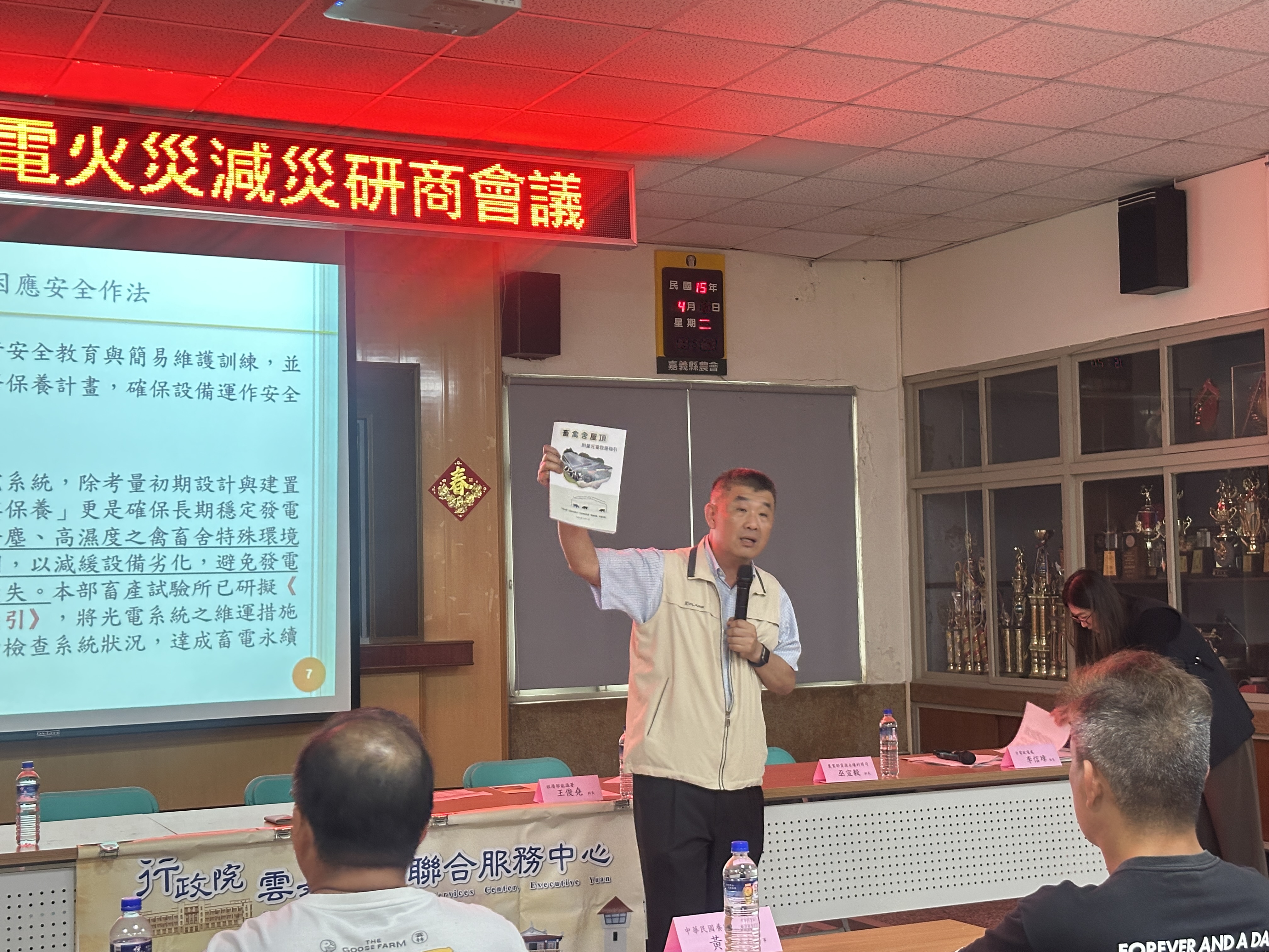 行政院雲嘉南區聯合服務中心於15日假嘉義縣農會2樓會議室舉辦「畜牧場屋頂光電火災減災研商會議」。本次會議由中心副執行長陳怡帆主持,並邀集農業部(畜牧司、資源永續利用司)、經濟部能源署、內政部消防署、台灣電力公司、工業技術研究院、嘉義縣消防局、太陽光電發電系統公會、相關協會及畜牧業者等單位代表與會,共同進行專題簡報與綜合座談交流。