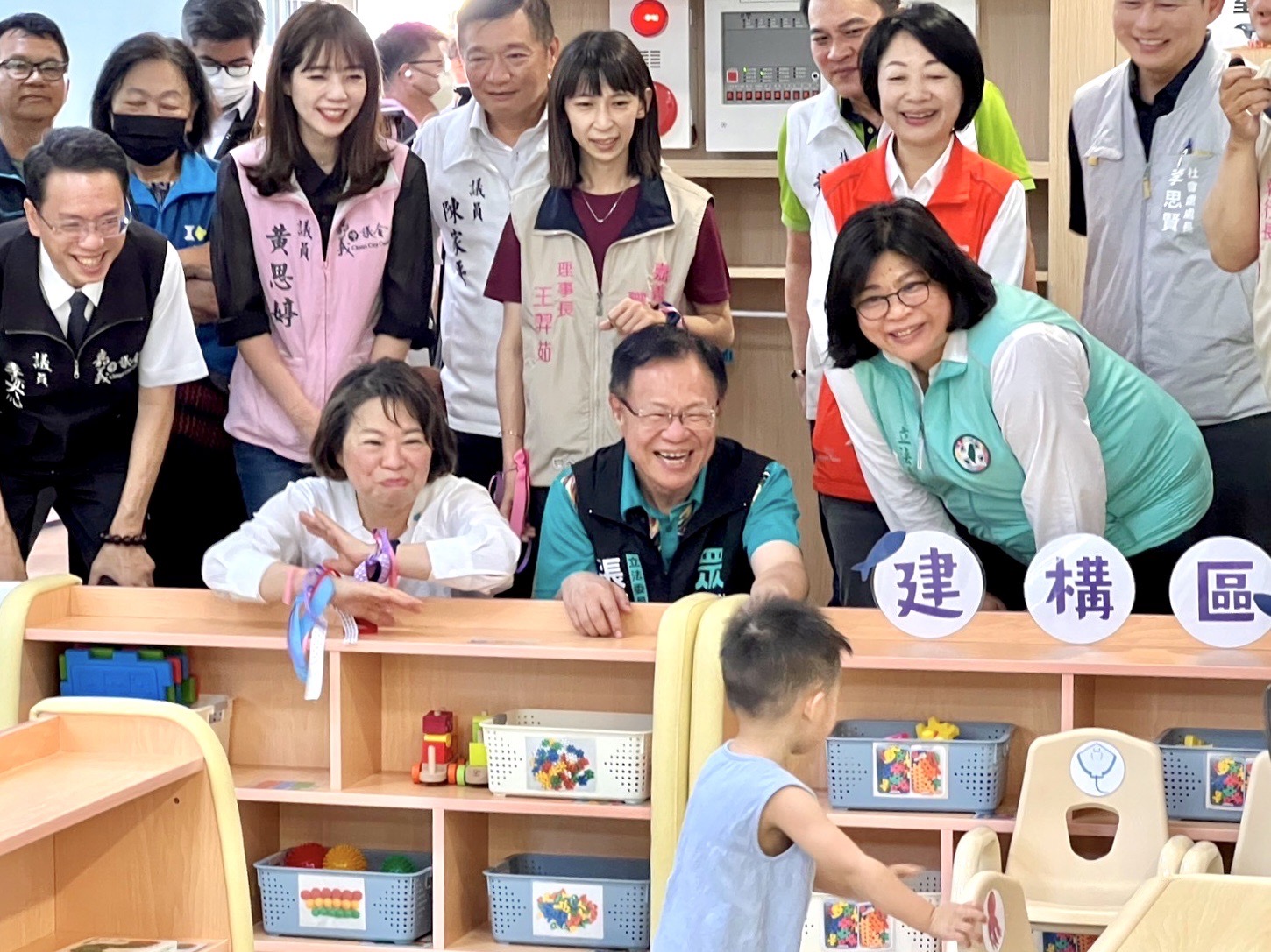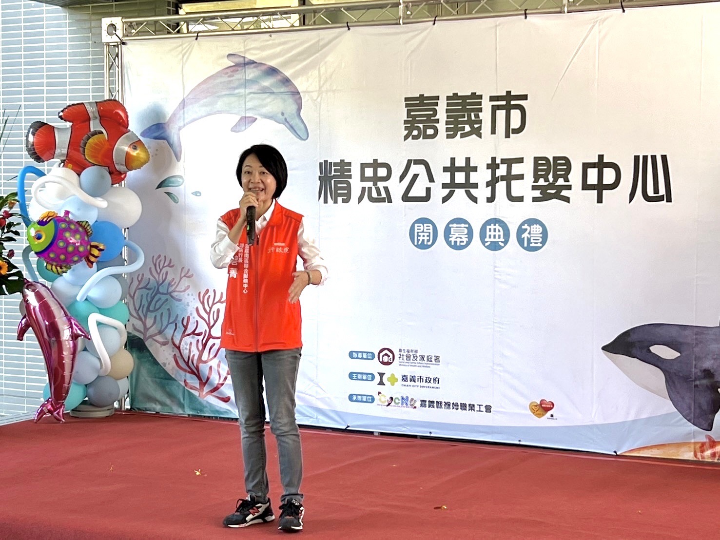 行政院雲嘉南區聯合服務中心副執行長李碧菁於29日出席嘉義市精忠公共托嬰中心開幕典禮揭牌儀式,開幕活動由小橘子幼兒園表演熱鬧開場。