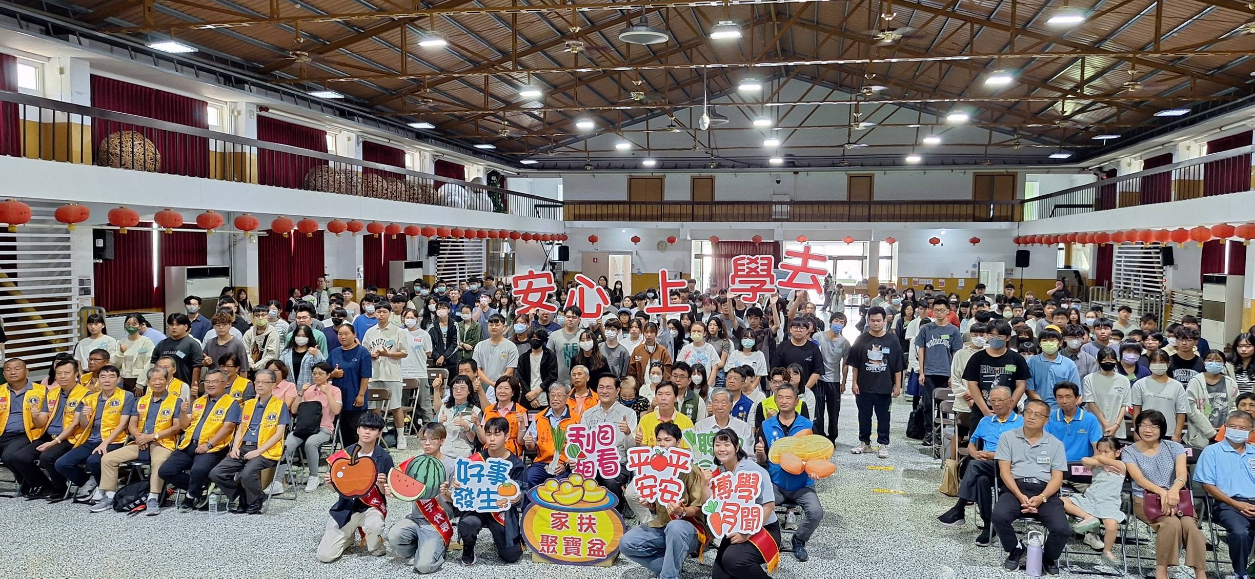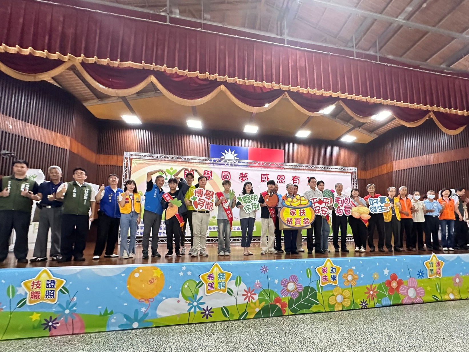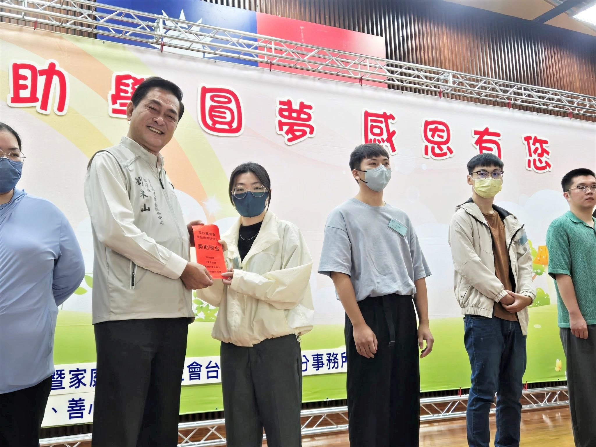 行政院雲嘉南區聯合服務中心執行長劉米山24日赴臺南市政府民治中心南瀛堂出席「助學圓夢•感恩有您」頒獎典禮,頒獎典禮由北台南家扶舉辦,頒發272 位大專和高中職學生450萬元助學金,九月將再發出100萬元獎助學金給430 名國中小學生,本學期共計700 名家扶兒少受惠。面對災難多端的今年,頒發儀式透過五種蔬果:蘋果(平安)、蔥(聰明)、胡蘿蔔(博學多聞)、花生《發生好事)、西瓜(刮目相看)祝福受獎同學。家扶學子黃昱翔同學分享追夢的樂趣及自立青年蔡佳錚分享學習歷程和人生故事,感謝各界助學援手,家扶助學工程圓滿順利舉行。