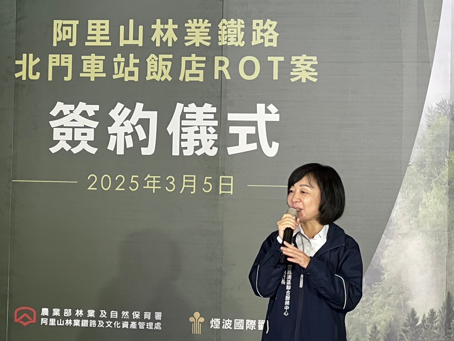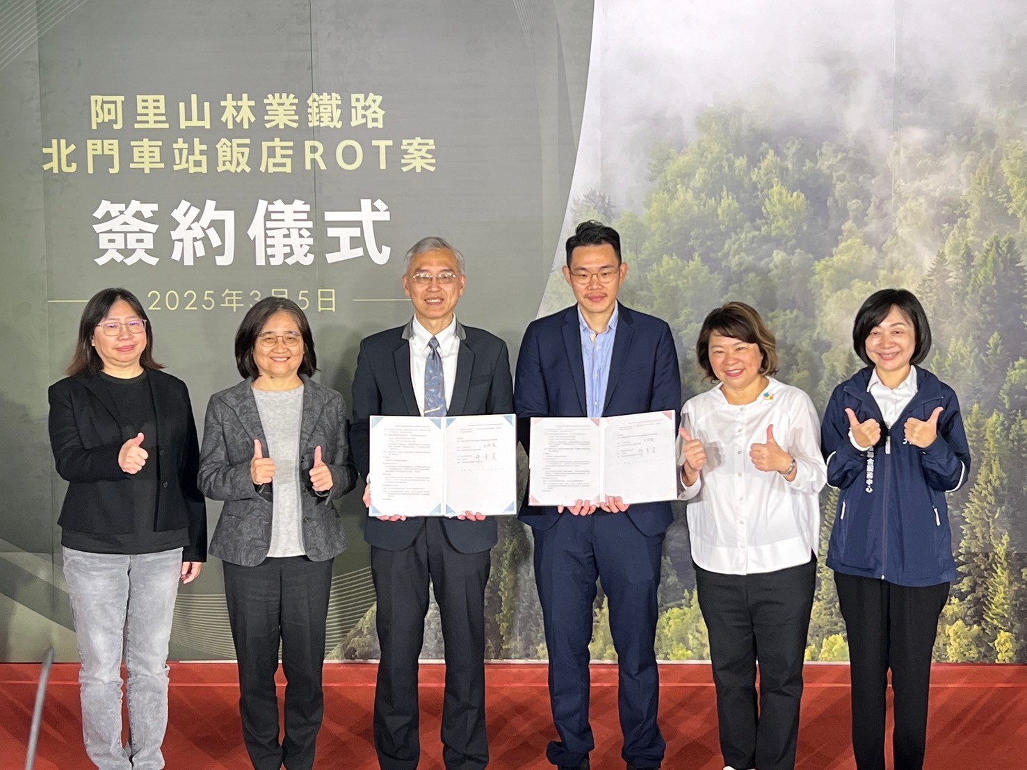 林業及自然保育署阿里山林業鐵路及文化資產管理處與煙波集團旗下「嘉波股份有限公司」,今(5)日雙方共同簽訂「嘉義市阿里山林業鐵路北門車站飯店修建營運移轉案」契約,委託營運20年,共同推展大嘉義觀光及林業、鐵道文化。行政院雲嘉南區聯合服務中心副執行長李碧菁受邀出席,與眾貴賓們共同見證。