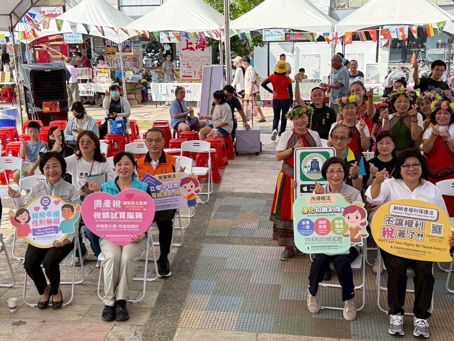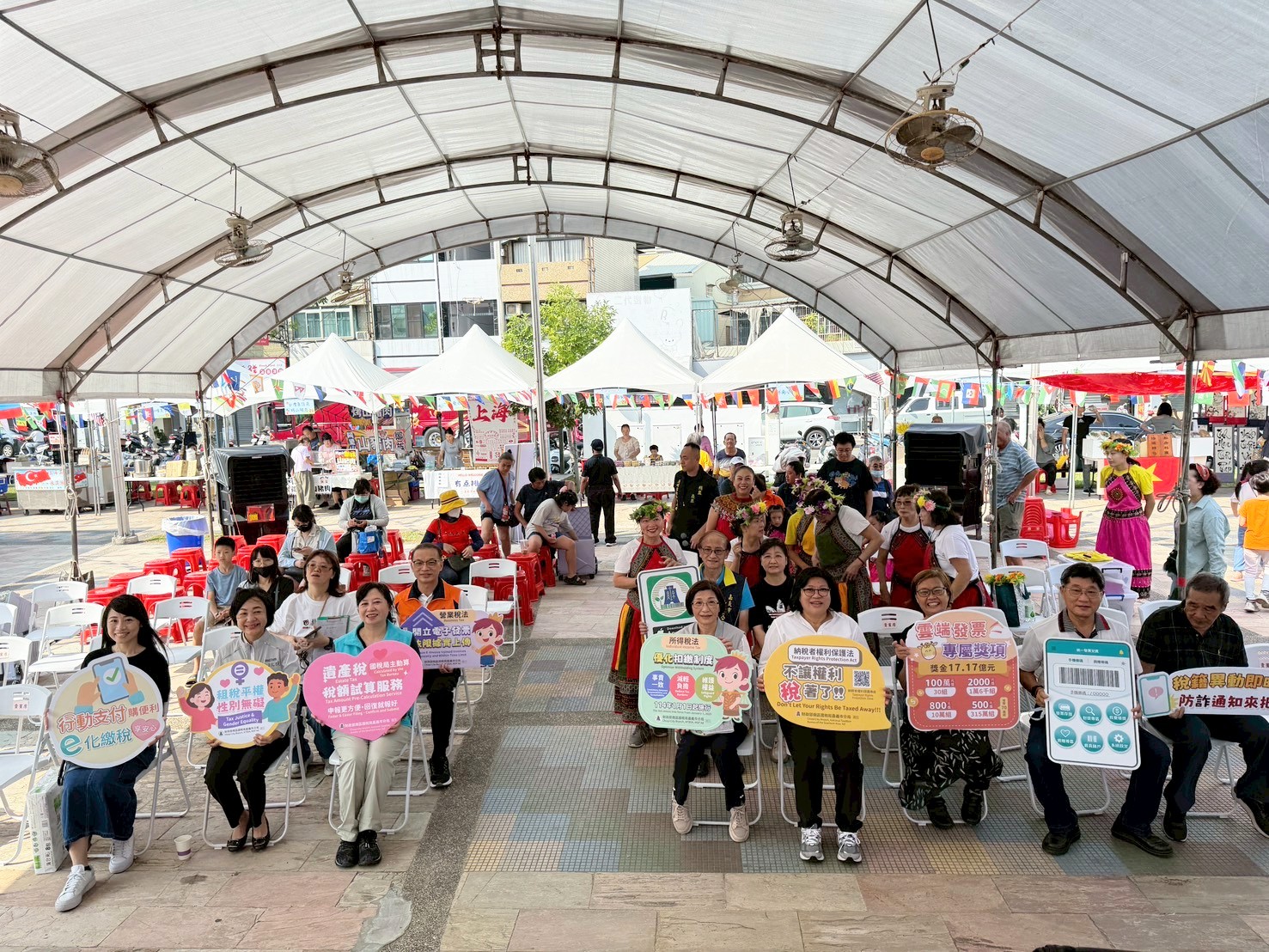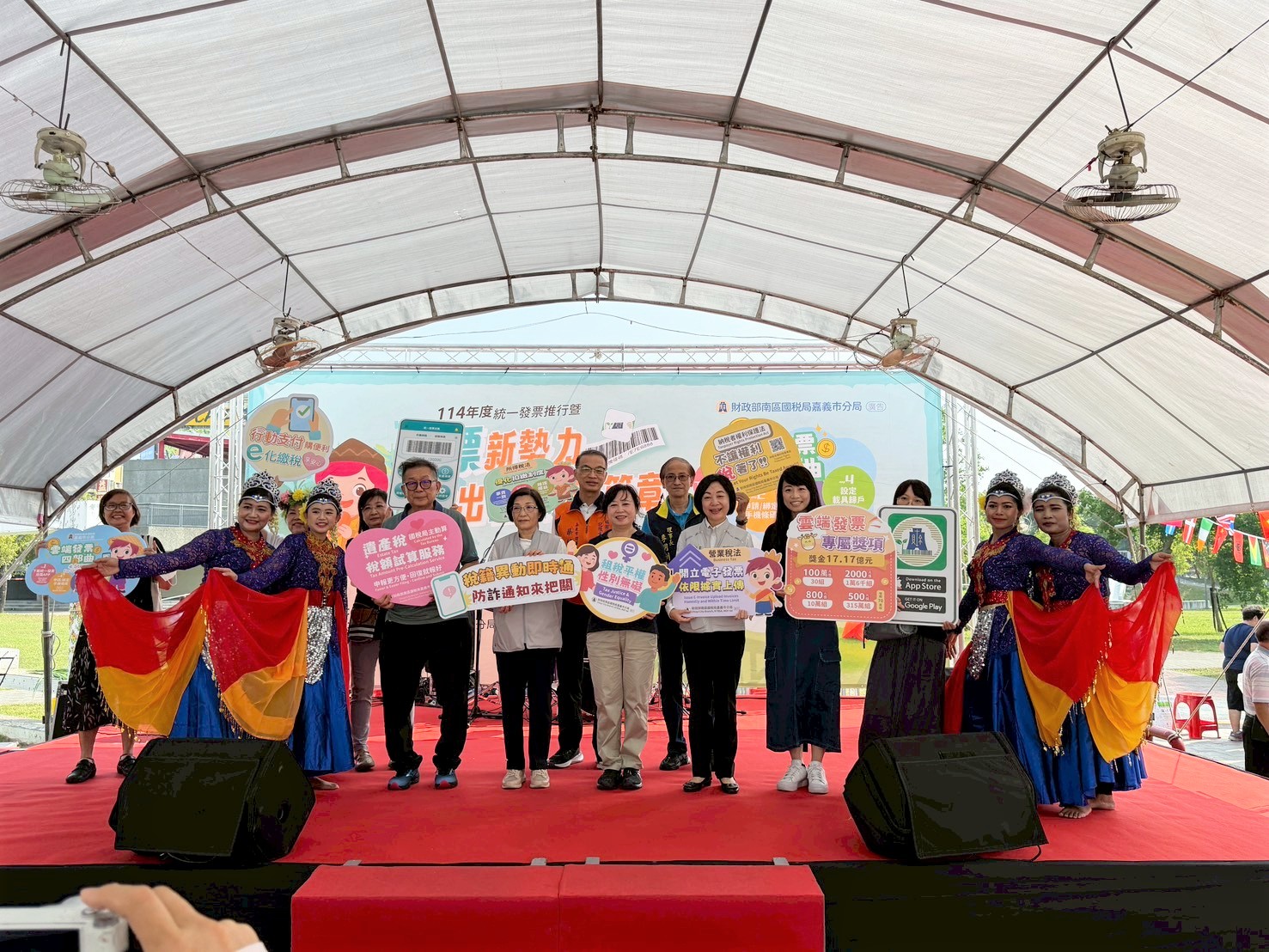 財政部南區國稅局嘉義市分局於18日在嘉義市中央廣場舉辦「發票新勢力 譜出雲端新篇章」租稅教育宣導活動,現場結合多國文化美食與表演,吸引眾多民眾參與。行政院雲嘉南區聯合服務中心副執行長李碧菁受邀出席,與民眾一同感受熱鬧氛圍。