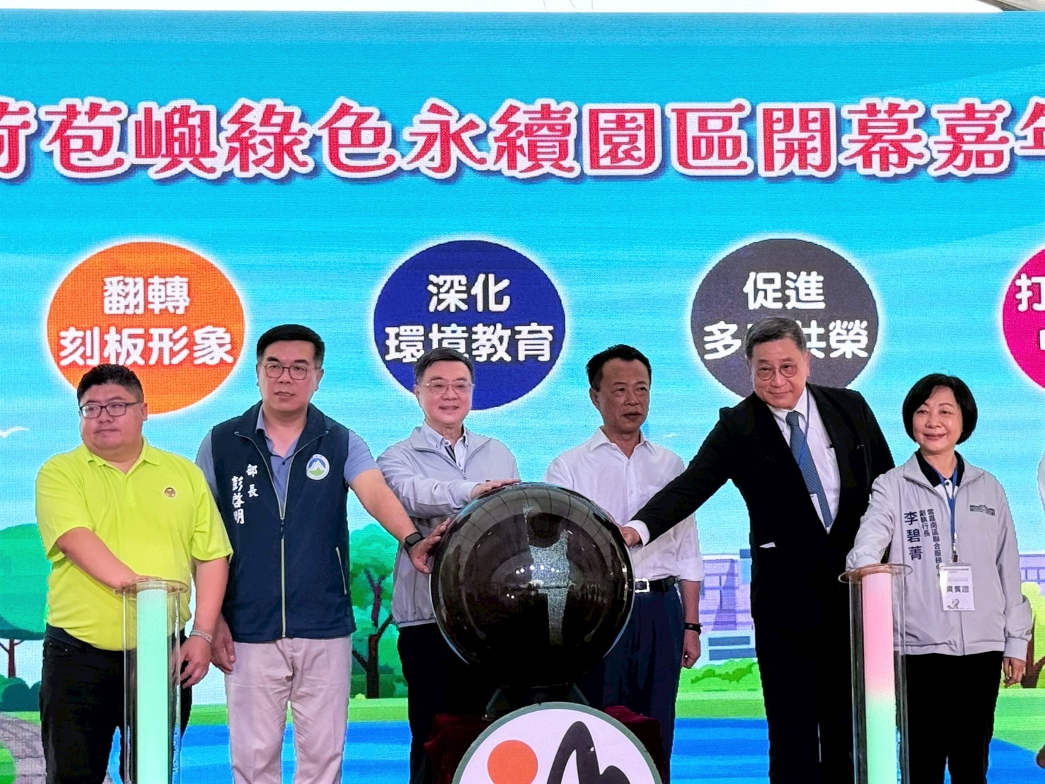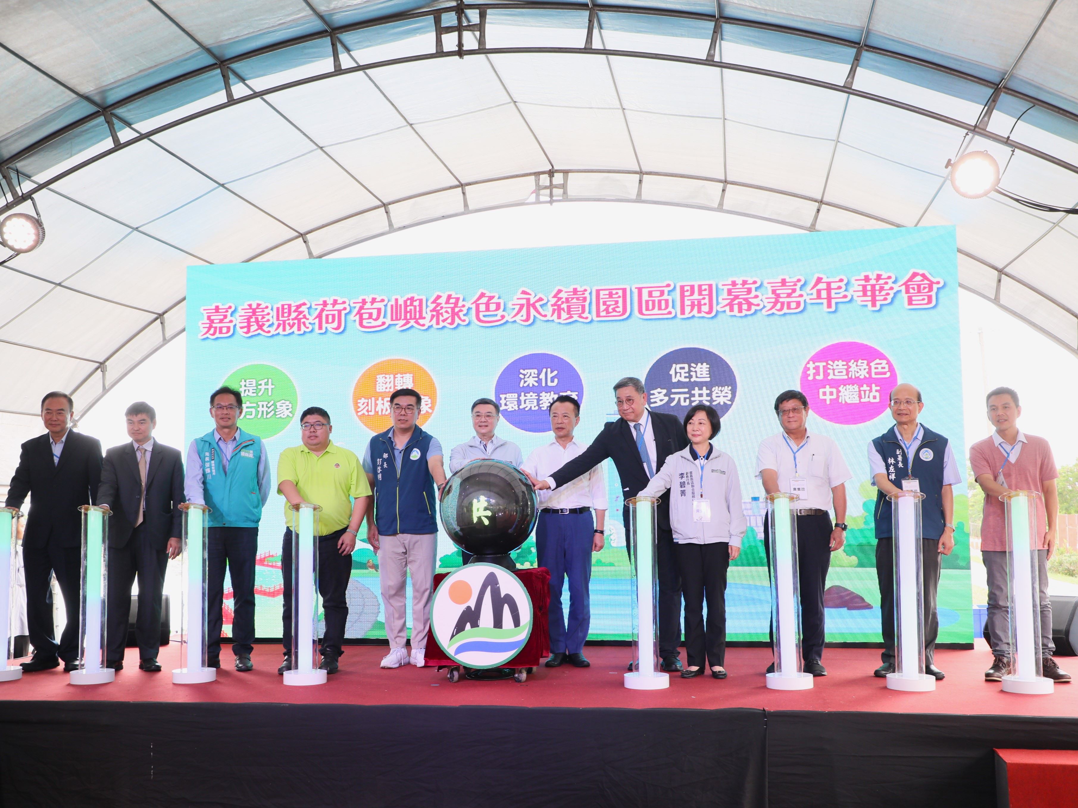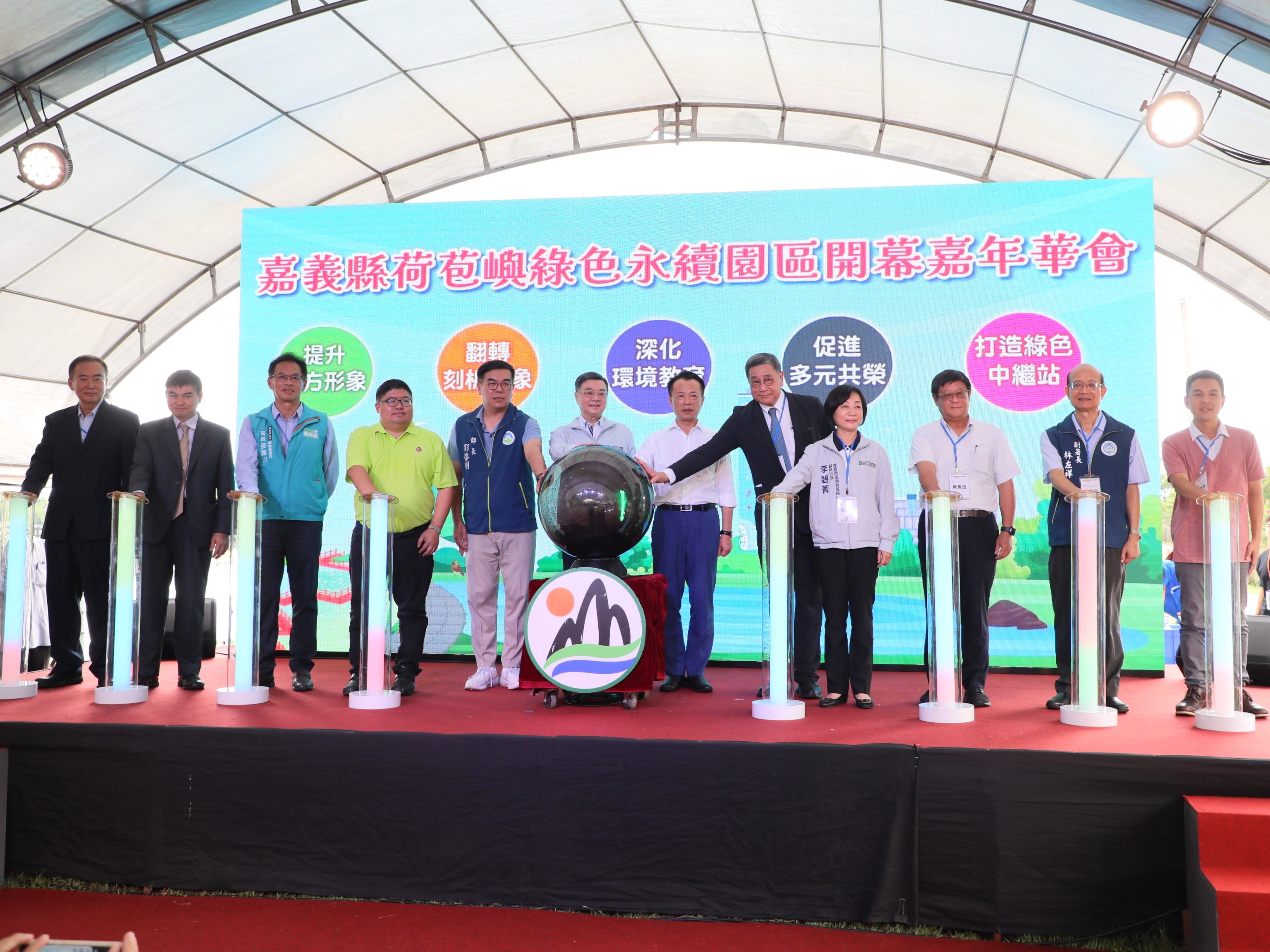 行政院雲嘉南區聯合服務中心李碧菁副執行長21日陪同行政院長卓榮泰出席「嘉義縣荷苞嶼綠色永續園區開幕嘉年華會」開幕儀式。