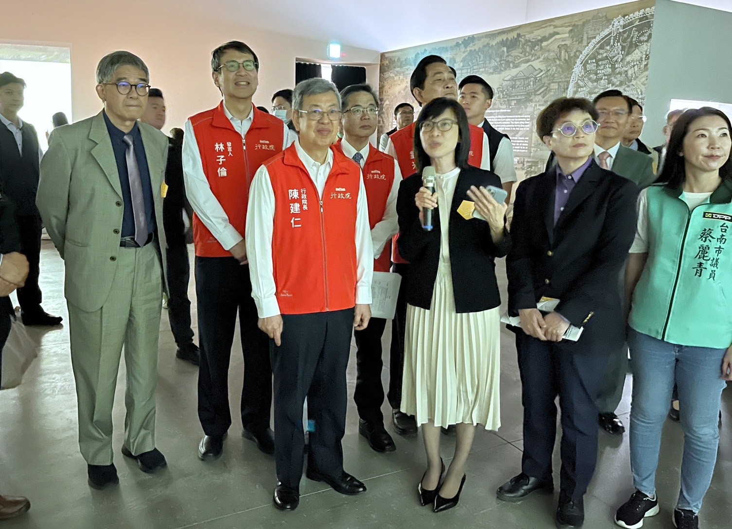 行政院長陳建仁於15日在行政院秘書長李孟諺、行政院雲嘉南區聯合服務中心副執行長劉米山、國立故宮博物院院長蕭宗煌、副院長黃永泰、副院長余佩瑾,立委陳亭妃、臺南市長黃偉哲、副市長趙卿惠、南美館館長林秋芳的陪同下,前往臺南市美術館出席「千載南逢-故宮國寶佇臺南」開幕記者會,首先欣賞表演藝術家張逸軍老師及家齊女中學生帶來的開場舞蹈「經緯交織的時光身影」;隨後參觀〈清院本清明上河圖〉數位動畫、〈翠玉白菜〉、〈玉龍紋盤〉與〈白玉錦荔枝〉等故宮典藏珍品,以及「富春印象」沉浸式劇場,對於透過AI技術繪製出歐洲巨匠畫風的「富春山居圖」,眾人皆感到讚嘆與驚豔。