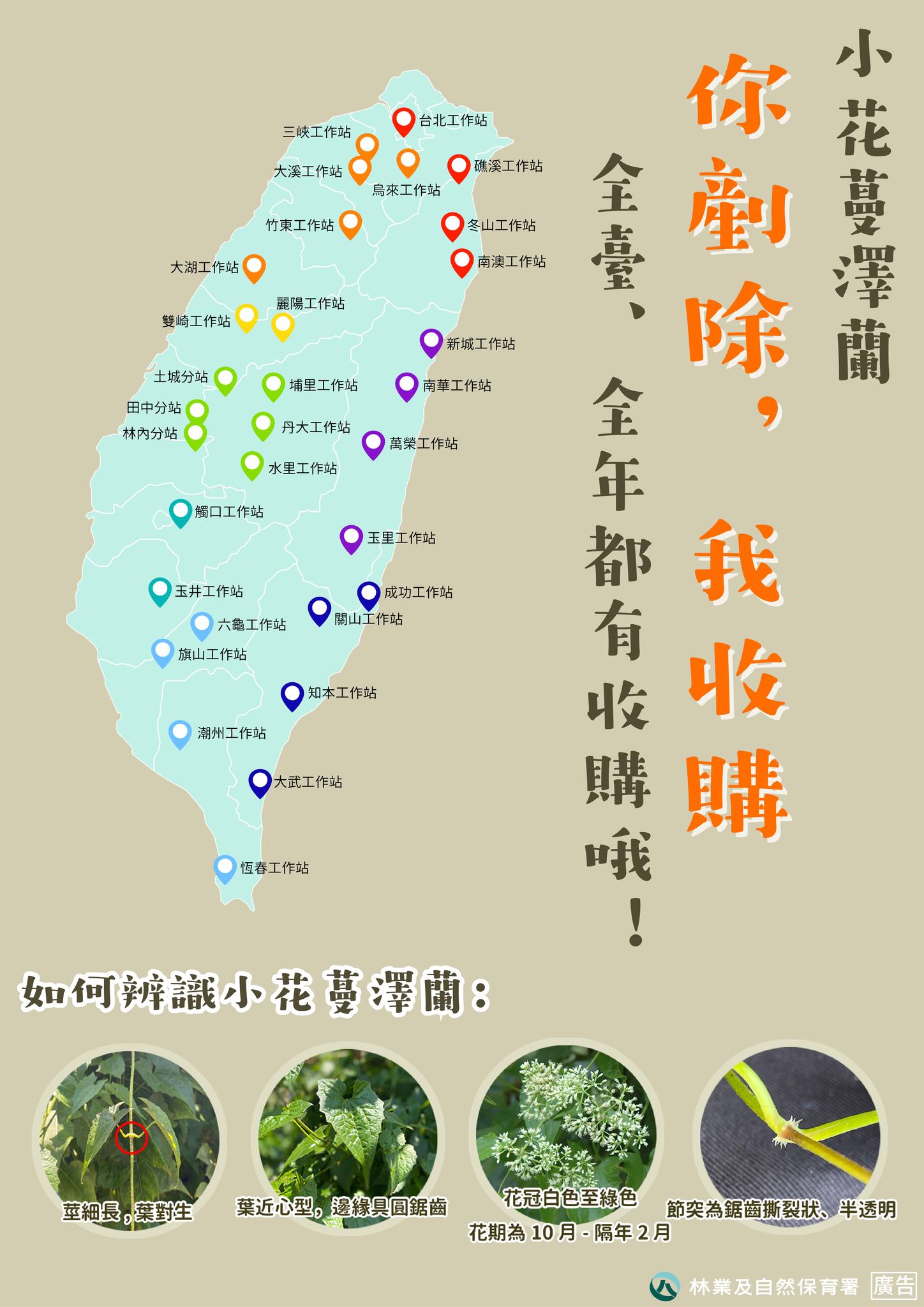 為鼓勵民眾一起除蔓護生態,今(112)年自1月1日至12月31日止,每星期一、三、五林業保育署嘉義分署於觸口及玉井工作站辦理小花蔓澤蘭、香澤蘭植物體收購,每公斤5元,歡迎大家一起來除蔓賺綠金,達到全民共同參與提升防治成效。連絡窗口可洽觸口工作站05-2593035柯小姐及玉井工作站06-5742031楊先生。