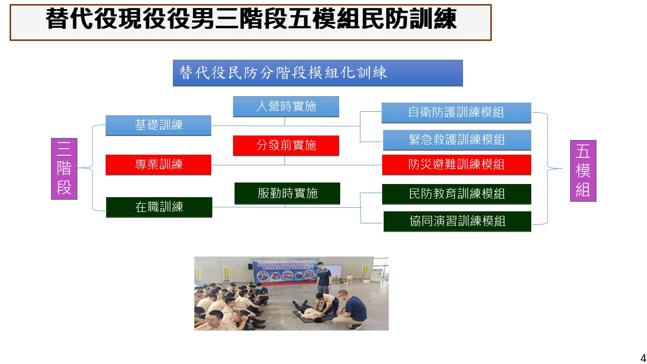 替管中心報告指出,為強化全社會防衛韌性,替代役男民防訓練區分為基礎訓練、專業訓練及在職訓練3階段,並結合各單位災害發生時的應變任務,規劃自衛防護、緊急救護、防災避難、民防教育及協同演訓5個訓練模組施訓,持續提升役男民防應變執勤能力,建立全民防災的認識與知識。