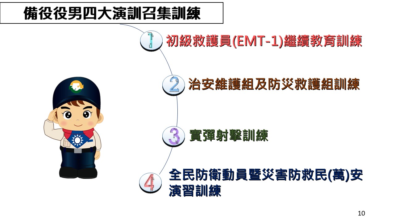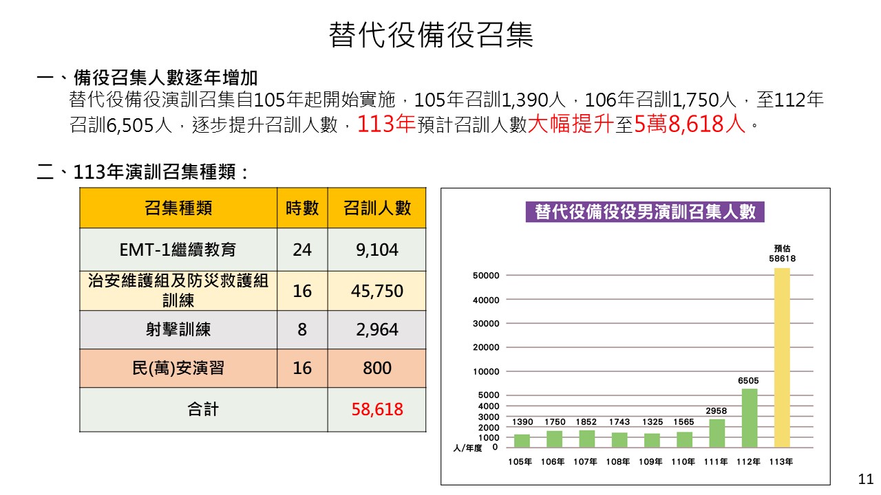 此外,因應全民國防兵力結構調整,替代役備役召集已成為國家整體安全防衛不可或缺的一環,役政單位從105年起實施召訓1,390人,逐年提升召訓人數,並規劃自今(113)年起擴大召訓量能,預計召訓5萬8,618人,著重在EMT-1繼續教育、治安維護組及防災救護組訓練、射擊訓練、參與民(萬)安演習訓練等4項演訓機制,使備役役男提升軍事基本技能,具備支援各民防團隊專業技能,以強化國家整體緊急救護量能,成為國家堅強的後盾。