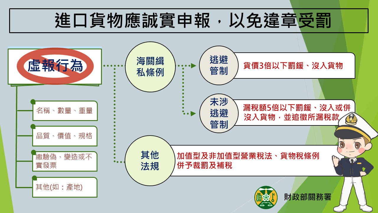 關務署說明,進口貨物經海關查驗結果發現實際來貨與申報內容不符時,不論是出於偽報、匿未申報、短報或漏報,均構成虛報行為,依據海關緝私條例第37條第1項及第44條規定,將依法裁處所漏進口稅額5倍以下罰鍰或沒入或併沒入貨物,並追徵所漏進口稅款;如虛報行為涉及逃避管制,依據同條例第37條第3項及第36條第1項、第3項規定,將裁處進口貨物貨價3倍以下罰鍰及沒入貨物。