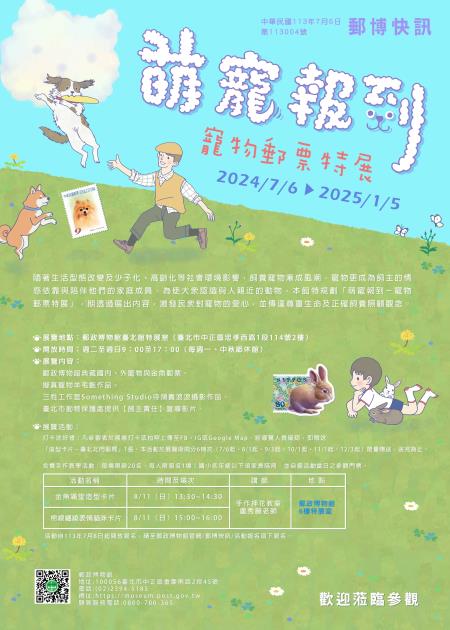寵物帶給人們無比的快樂和幸福,不僅是主人的情感依靠,甚至成為親密的家庭成員。中華郵政公司為使大眾更加認識可愛且與人親近的熱門寵物,傳達尊重生命及正確照顧觀念,訂於113年7月6日至114年1月5日在郵政博物館臺北館特展室舉辦「萌寵報到-寵物郵票特展」,期透過純真可愛的動物郵票、擬真毛小孩羊毛氈與待領養浪浪攝影作品,激發民眾對寵物的愛心,共同學習愛與奉獻的生命教育。
